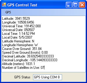 The GPSControl (VS 2005, download here, about 900 KB) (VS 2008, download here about 80 KB - this fixes a problem under Vista x64, this is the control only, download the VS 2005 version for an example of its use) is comprehensive serial GPS decoder solution provided free of charge * (see the footnote). Simply copy the GPSControl.dll file to your .NET solution, add it to your toolbox, and then drop the GPSControl on your form. The control allows you to incorporate GPS features in you application as simply and easily as possible. I have included a simple VB 2005 example in the download. Here is a screen shot: